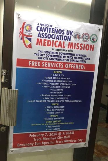 Over the past 5 years, Cavitenos UK Association has been actively hosting food feeding programs and medical mission to different areas of Cavite. Our charity was able to provide aid to more than 200 children and offer student scholarship to those in need. Cavitenos UK Association has also provided medical mission programmes to some parts of Cavite which includes Indang, Trece Martirez, Gen Tries & Alfonso. We continue to work hard despite the recent pandemic and our organization will continue to aid to our full extent where needed, whether it is back home or here in UK.